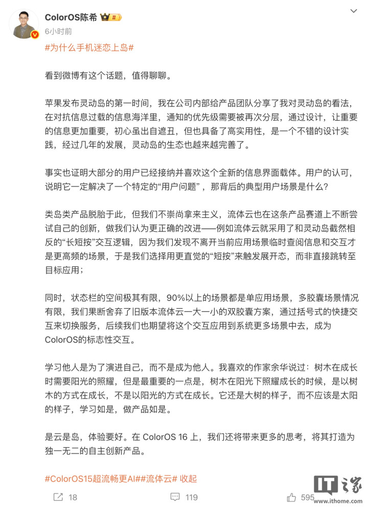 IT之家9月4日消息,OPPOColorOS设计总监陈希今天下午在微博发文谈“为什么手机迷恋上岛”,其表示,看到微博有这个话题,值得聊聊。